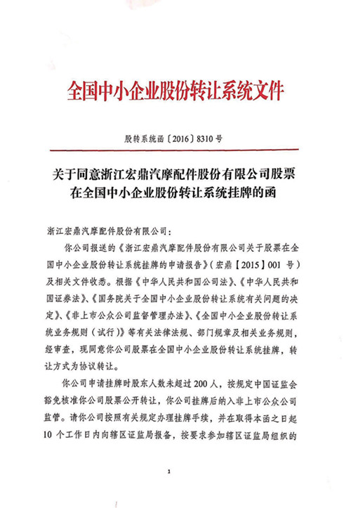 關于同意浙江宏鼎汽摩配件股份有限公司股票在全國中小企業股份轉讓系統掛牌的函